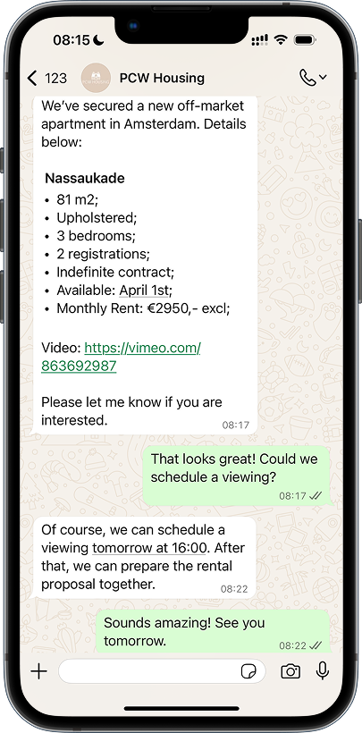 Had the absolute best experience working with PCW Housing. They were so attentive, efficient, and made sure I got my dream flat in Amsterdam! Highly recommend working with PCW Housing— especially if you're an expat.